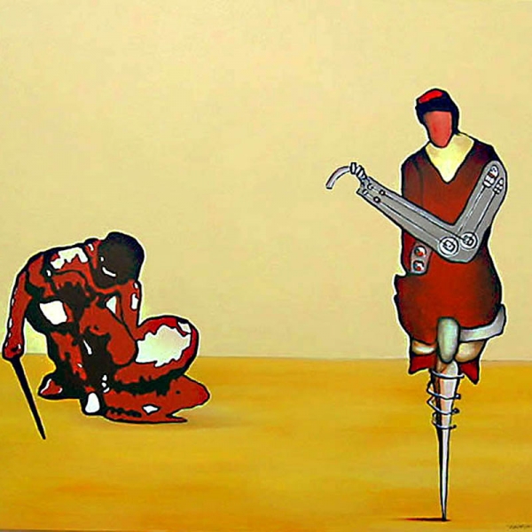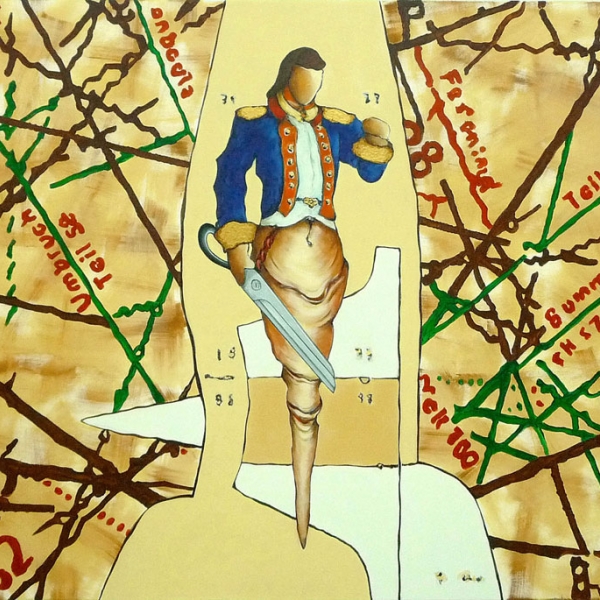 Die „40 Titans“ sind inhaltlich und kompositorisch paarweise aufeinander bezogen, sei es als Partner oder als kontrastreiche Gegenspieler. Die beiden Ältesten unter den modernen Titanen stehen am Anfang der Ausstellung. Sie markieren den Aufbruch in die Neuzeit, dennoch können ihre Biografien kaum unterschiedlicher sein. Jakob.... (1459-1525) war seinerzeit der bedeutendste Kaufmann und Bankier in Europa. Aufrecht und stark wird er als Vertreter einer frühen Globalisierung vor der Weltkarte präsentiert. Neben ihm Ignatius....... (1491-1556), dessen tänzerisch ausponderierte Gestalt im Brustharnisch den Lebenswandel vom adligen Ritter zum Begründer des Jesuitenordens versinnbildlicht.